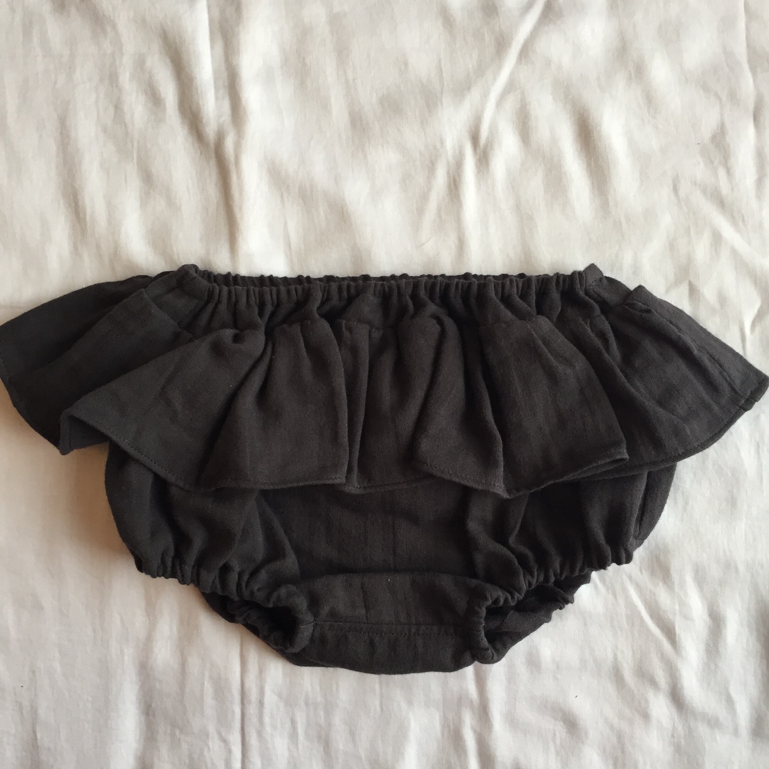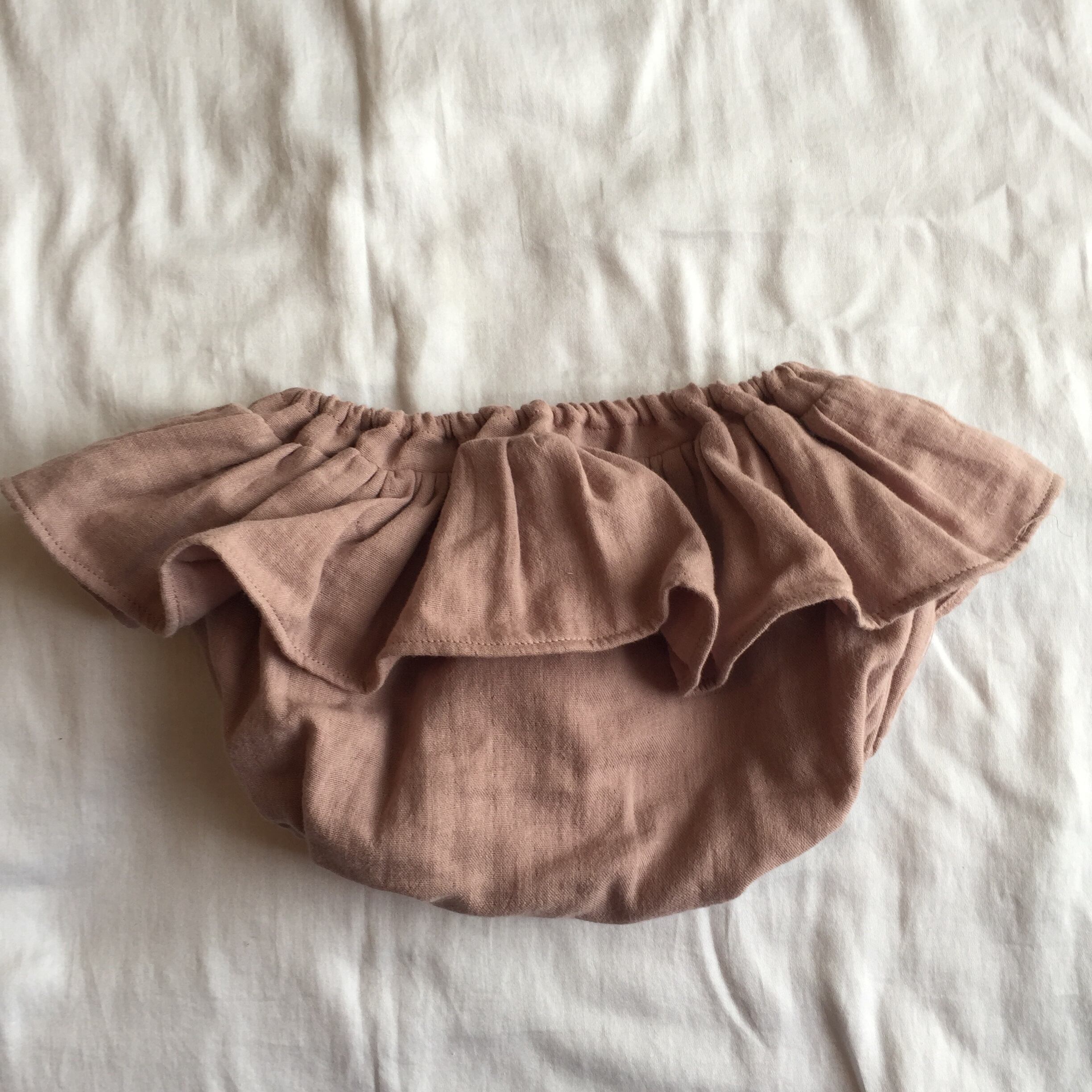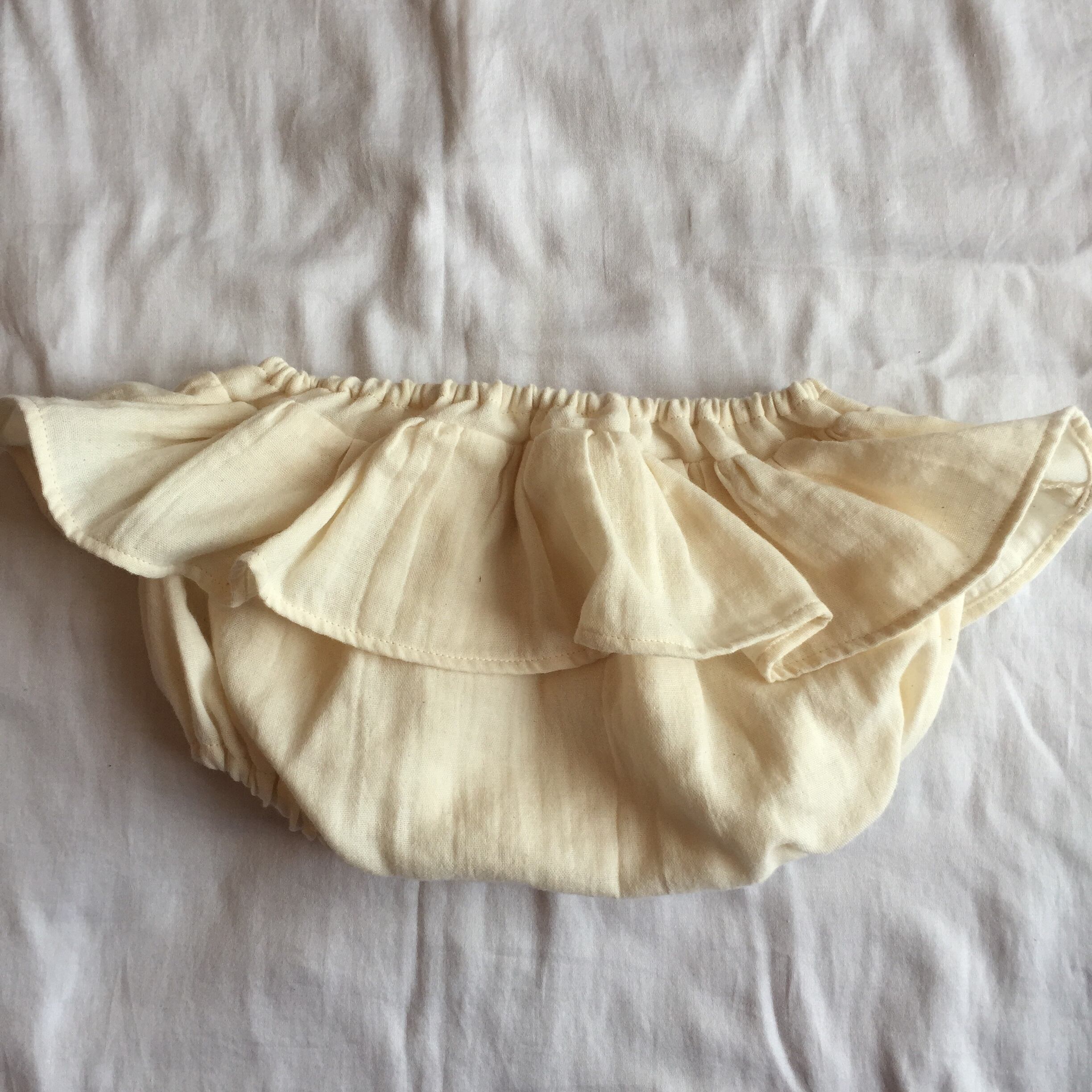 SOLD OUT肌ざわりと風合いのよいガーゼ素材のフリルブルマです。パフキュロット型のパンツにフリルをつけたブルマはオムツの赤ちゃんにぴったり。サイズは80ですが、6ヶ月頃から着用いただけますし、オールシーズン対応なので長くご愛用いただくことができます。カラーはシックなチャコールグレー、コーディネイトが楽しめるマスタード、優しい色合いのピンク、プレゼントにもおすすめなエクリュ。